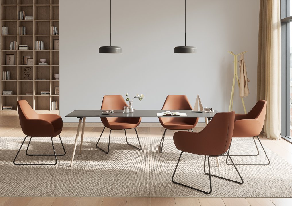 De Profim Fan stoelen vormen een veelzijdige zitlijn met een herkenbare, licht gebogen kuipvorm die zowel in vergader- als hospitalityruimtes goed tot zijn recht komt. Binnen de reeks zijn er meerdere varianten, van compacte stoelen tot uitvoeringen met armleuningen en modellen die zich beter lenen voor langer zitten. Afhankelijk van de uitvoering kan je doorgaans kiezen tussen verschillende onderstellen, zoals een klassiek 4-poots frame, een sledeframe of een draaibasis, zodat de stoel past bij het gebruik en de gewenste dynamiek aan tafel. Ook qua afwerking is er veel speelruimte, met uiteenlopende stofferingen en framekleuren om de look projectmatig consistent te houden. Daardoor kan je de Fan-lijn breed inzetten en toch per ruimte de juiste combinatie van comfort, uitstraling en functionaliteit samenstellen.