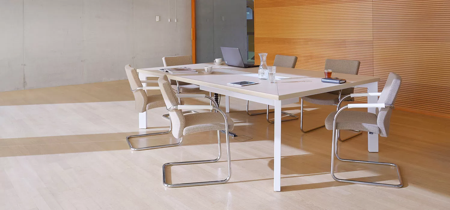 De Vepa Lift is een vergadertafel die meebeweegt met de gebruiker en zowel zittend als staand werken ondersteunt. Je kiest tussen een vaste tafelhoogte van 75 cm of een elektrisch verstelbare zit sta uitvoering die doorgaans van 75 tot 115 cm gaat en bediend wordt met een hoog laag toets met display onder het blad. Het programma biedt rechthoekige en vierkante bladen van ongeveer 34 mm dik, met keuze voor een opleggend blad of een tussenliggend blad in het frame. Praktisch is de integratie van kabelgoten en stroompunten, zodat aansluitingen netjes weggewerkt zijn en de tafel klaar is voor intensief overleg. Door het stevige vierpoots metalen onderstel en de verschillende maatopties is Lift breed inzetbaar, van compacte teamruimte tot grotere vergaderopstelling.