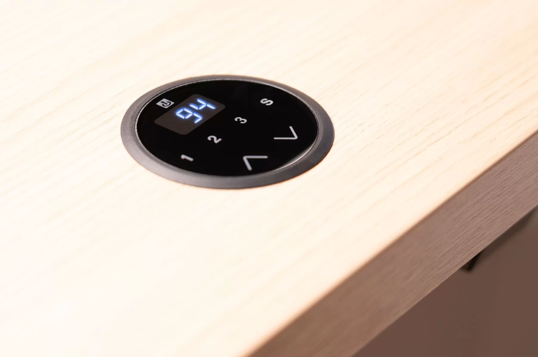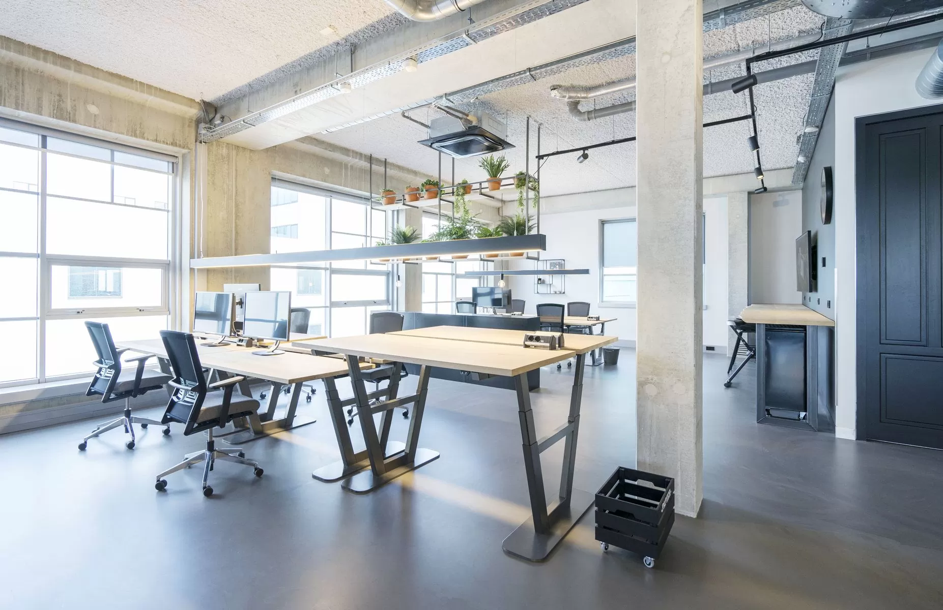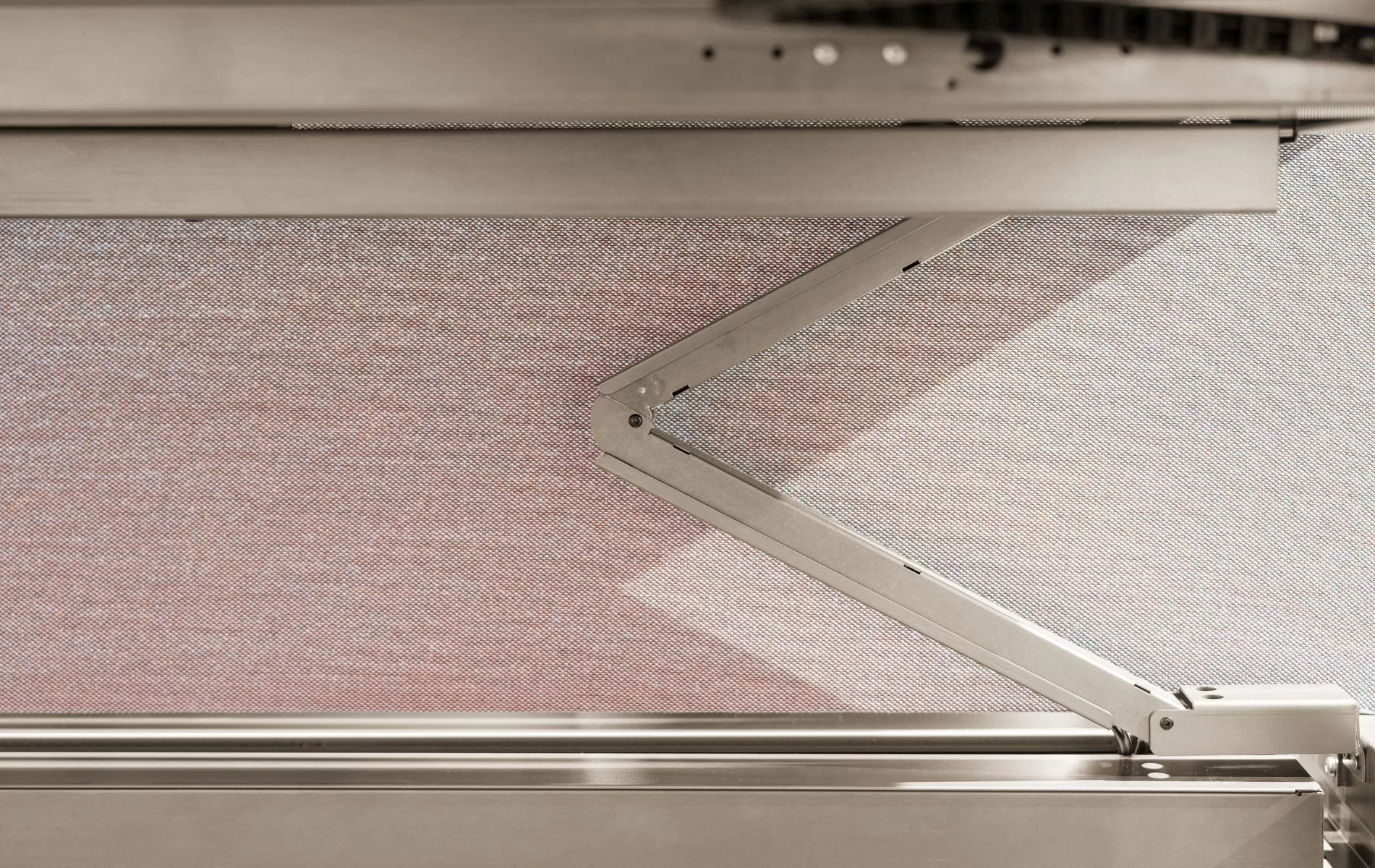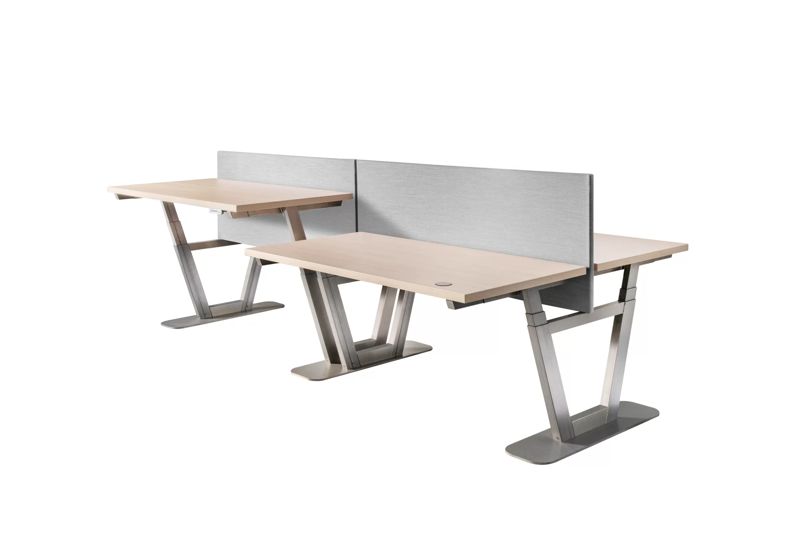Ergonomische zit/sta werkplek Een meubel dat ‘eigenlijk niet kan’, de gebruiker verrast en uitdaagt tot dynamisch werken ParQ koppelt een schuin verstelbare poot aan een perfect verticale beweging van het blad. Door een vernuftig mechanisme onder het blad wordt de horizontale bewegingscomponent van de schuine verstelling volledig gecompenseerd, komt het blad niet ‘naar de gebruiker toe’ en beweegt het volledig parallel aan de optionele tussenwand omhoog. Door deze techniek staat de poot extreem ver naar achter en zorgt dit voor een optimale beenvrijheid onder het bureau of een cluster van bureaus. De voetplaat zorgt voor extra stabiliteit, koppelt duowerkplekken tot benches en zorgt ook voor een veilige afstand tot andere bureaus, kasten of andere vaste objecten.