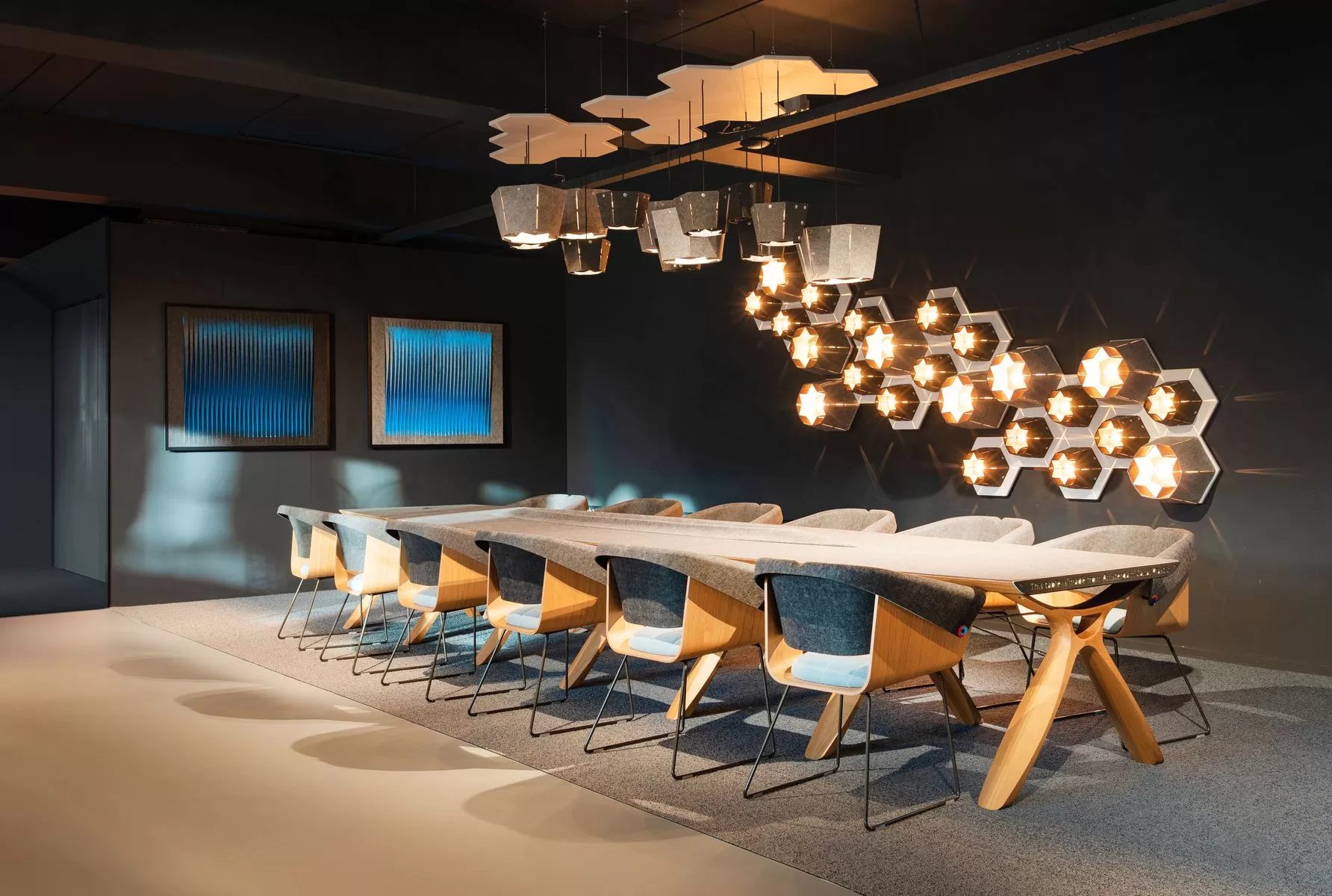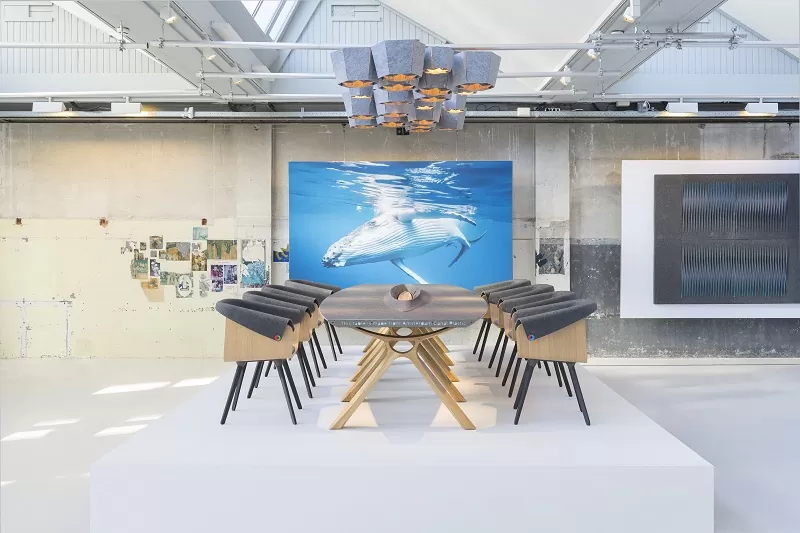 De Whale Boardroom Table is een opvallende vergadertafel waarvan het ontwerp is geïnspireerd op een walvis aan het wateroppervlak, met een herkenbaar blaasgatdetail en grafische lijnen in het blad. Het tafelblad is opgebouwd uit meerdere modulaire segmenten en combineert geperst gerecycled PET vilt met een kern van gerecycled PET schuim en houtlagen voor een solide, luxueuze afwerking. De poten in duurzaam gecertificeerd eiken verwijzen naar de botstructuur van een walvis en geven de tafel een krachtige, sculpturale uitstraling. Voor praktisch gebruik kan de tafel uitgevoerd worden met een centrale aansluitunit voor stroom, en er zijn opties om het inlegdeel en de afwerking projectmatig te personaliseren. De Whale Boardroom Table is verkrijgbaar in uitvoeringen die geschikt zijn voor ongeveer acht tot twaalf personen, waardoor hij inzetbaar is van compacte directieruimte tot grotere boardroom.